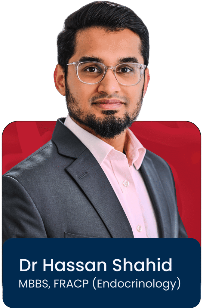 Dr Shahid is deeply committed to evidence-based medicine and continuously updates his clinical knowledge to ensure his patients receive care aligned with the latest research and guidelines. He is an active member of the Endocrine Society of Australia, the US Endocrine Society, the Australian and New Zealand Bone and Mineral Society, and the Australian Diabetes Society.